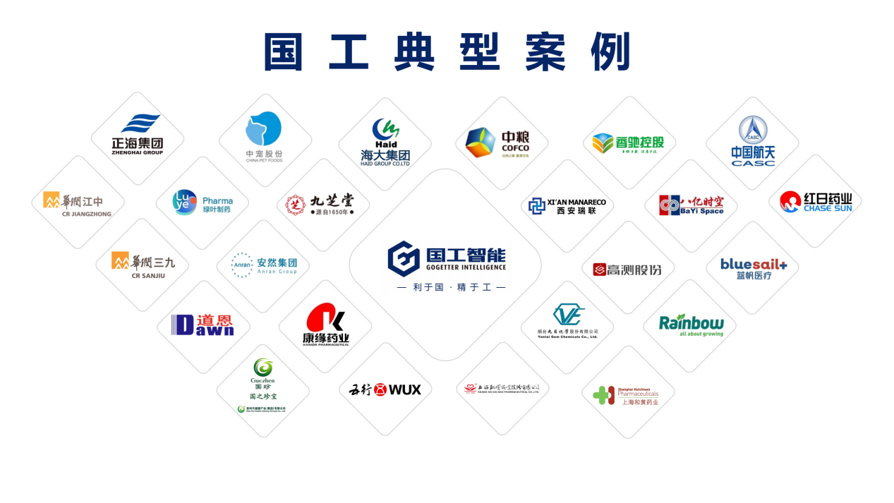 國工智能在化工、醫藥、食品、飼料、新材料等行業深耕已久,客戶遍布全國,已成功為海大集團、華潤三九藥業、康緣藥業、豐原集團、道恩集團、九目化學、藍帆醫療、新時代健康產業集團、安然納米集團等客戶提供智能制造落地服務。