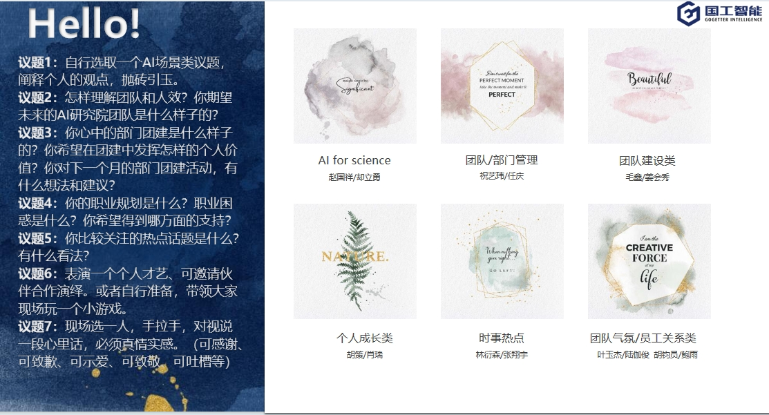 活動以“AI暢想”為核心,圍繞學術議題、團隊管理、個人成長等多個維度展開討論,充分展現了國工智能團隊的專業素養和創新精神。通過“對AI技術的產業落地應用”等議題認領和現場互動環節的依托,國工智能不僅收獲了團隊成員間更深層次的相互理解和信任,還加強了團隊成員間的溝通與協作能力,這將為公司未來的發展提供堅實的人文基礎。活動中,每位參與者都獲得了寶貴的交流機會,無論是在專業領域的深入探討,還是在個人層面的情感交流,都極大地豐富了團隊的文化內涵。