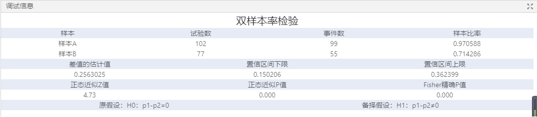 使用雙樣本率檢驗組件可執(zhí)行確定兩個組的總體比率是否不同和計算可能包括總體比率之間差值的值范圍。