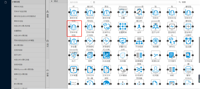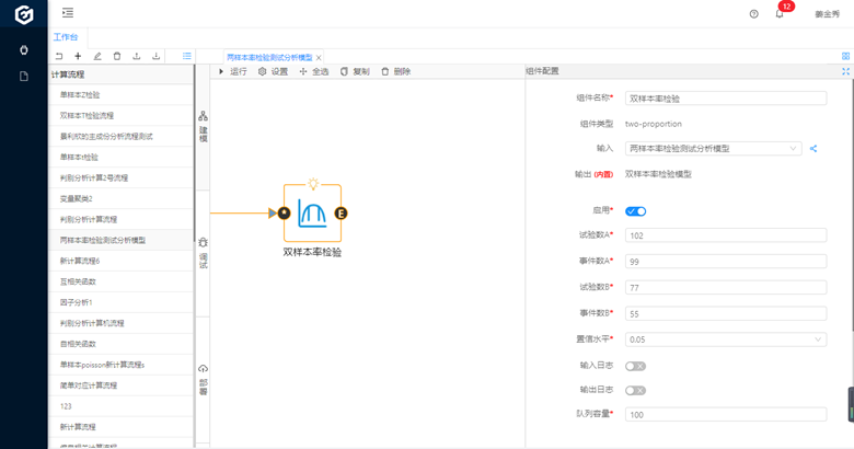 采用拖取的形式從數(shù)據(jù)大腦中的組件面板查找雙樣本率檢驗組件,拖到到工作面板。
