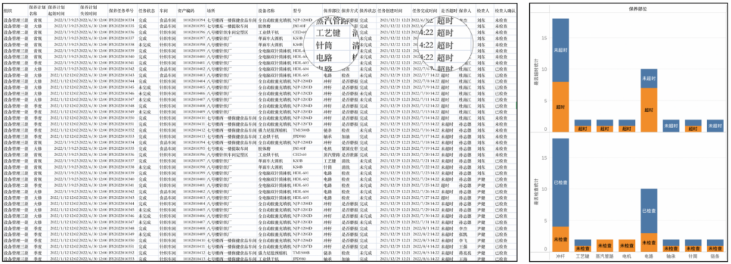 這還并不能體現出來可視化的最大價值,再回答一個問題:“保養部位中超時的多少是否與檢查人確認有關?”針對這個問題通過表格給出答案已經非常具有挑戰了,通常需要經過編程或SQL來輔助完成計算的工作,但是類似這樣的問題會有很多,如:不同部門在不同車間中設備保養狀態與生產產量之間的對比情況如何?