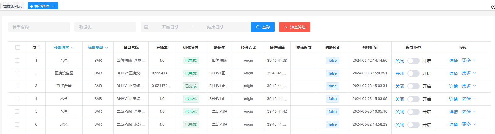4. 靈活性強(qiáng),針對(duì)企業(yè)同一精餾裝置精餾回收不同溶劑的情況,可以分別建立模型,提高智能光譜儀的靈活性和適應(yīng)性。操作簡(jiǎn)單,生產(chǎn)人員經(jīng)過簡(jiǎn)單培訓(xùn)即可完成在線光譜儀的建模、維護(hù)等相關(guān)操作。下圖為同一精餾裝置精餾不同溶劑時(shí)不同檢測(cè)指標(biāo)的模型示例。