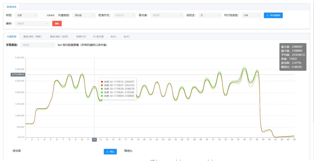 將每組采集到的21條數據進行查看,光譜圖顯示同組內數據的波動率都在2%以內,數據較為穩定。如下圖