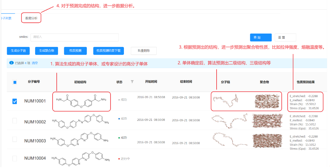 需要研發(fā)滿足某特定功能的新高分子材料時,可以利用性能預測模型快速篩選出具備潛力的單體分子。再利用分子量分布預測方法評估該單體在給定聚合條件下得到的分子量分布,然后基于單體、分子鏈和反應條件進行更準確的性能預測,如果滿足需求則進行實驗驗證,從而顯著的縮小需要搜索的化學空間。最后利用工藝優(yōu)化算法確定最優(yōu)的合成條件從而完成單體-結構-合成條件的研發(fā)流程。