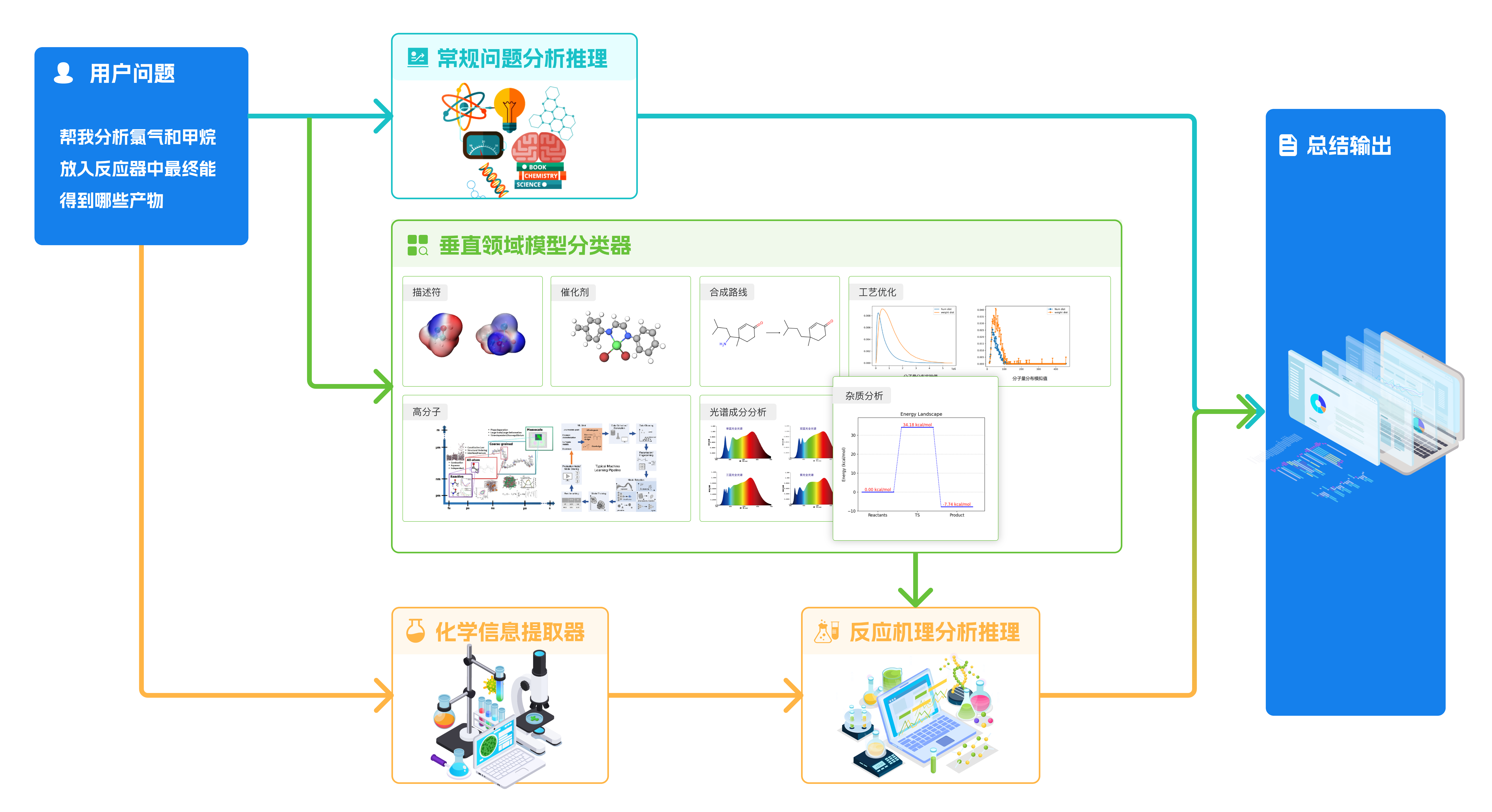 「國工化工大模型」改變了大模型的“文科生”設(shè)定,朝著“理科生”深度進(jìn)化。大模型技術(shù)與國工智能AI for Science領(lǐng)域的垂直能力深度融合,針對具體問題進(jìn)行識別后,聯(lián)動調(diào)用「合成推演」、「催化劑設(shè)計」、「分子動力學(xué)及計算化學(xué)描述符構(gòu)效關(guān)系計算」、「構(gòu)效關(guān)系計算」、「產(chǎn)物預(yù)測」、「量熱預(yù)測」、「實驗/工藝優(yōu)化」、「高分子配方與性能預(yù)測」、「譜圖逆分析」等15種垂直領(lǐng)域模型進(jìn)行協(xié)同分析,真正實現(xiàn)大模型在化工場景的“深度思考”。