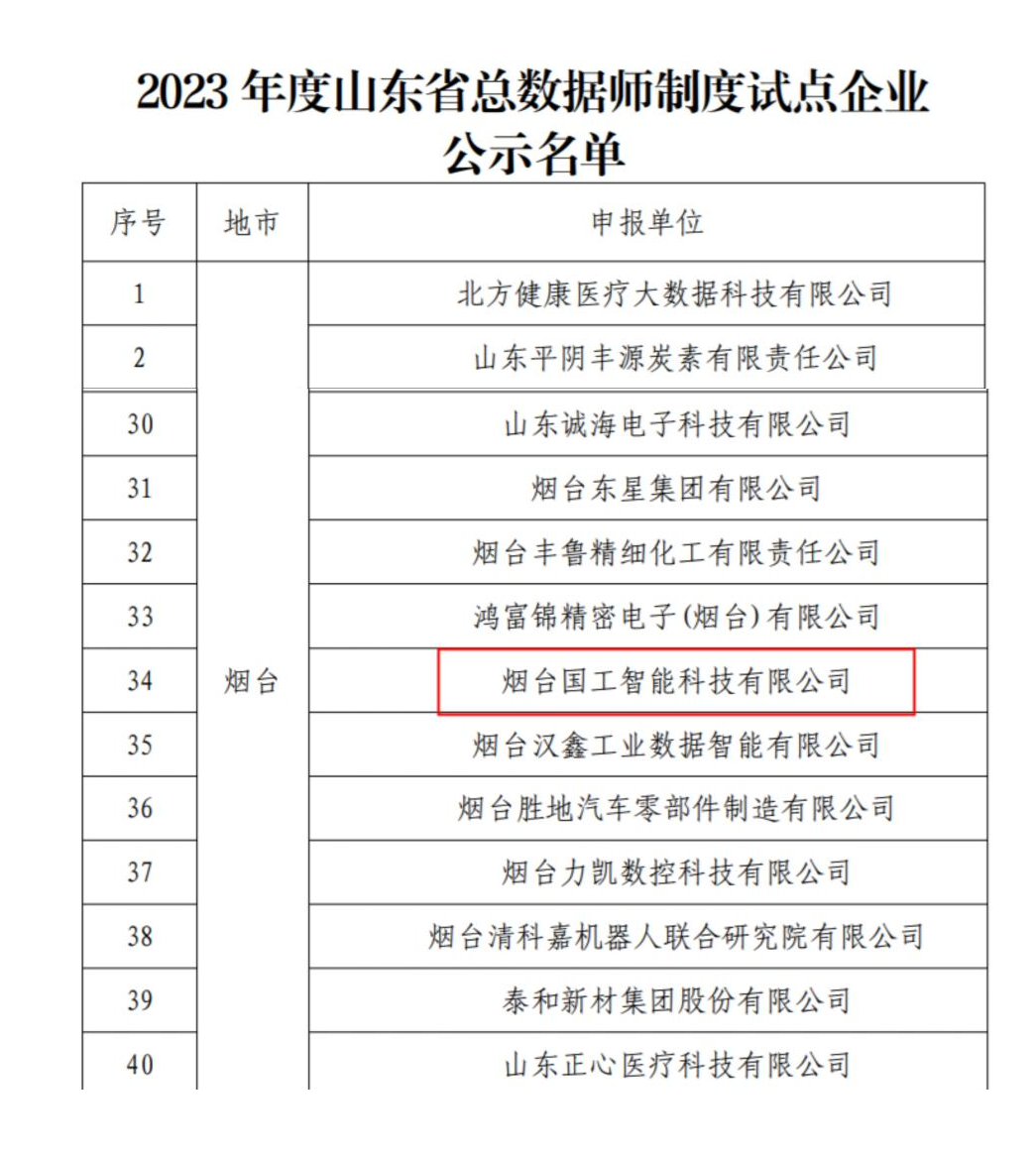 2023年12月20日,省工信廳公示了2023年度山東省總數據師制度試點企業入選名單,煙臺國工智能科技有限公司“榜上有名”。